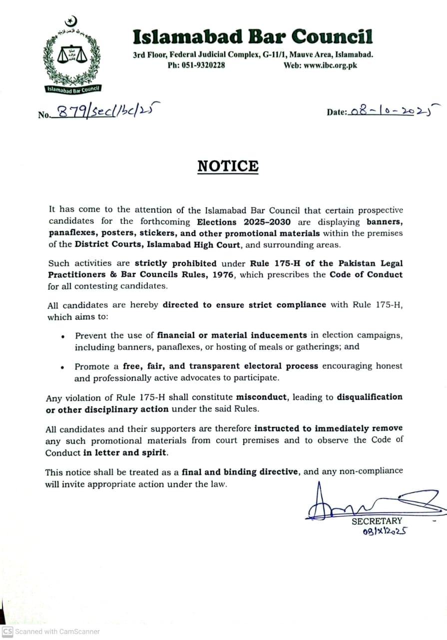 Islamabad Bar Council represents the practicing barristers in Islamabad.